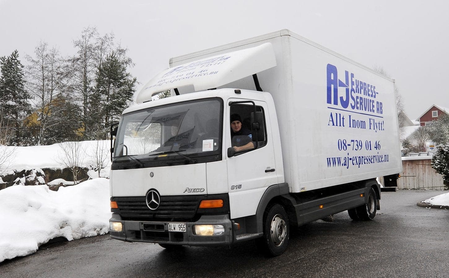 En vit flyttbil med företagsnamn och kontaktuppgifter kör på en vinterväg, redo för flyttuppdrag i Stockholm, Uppsala och Norrtälje.