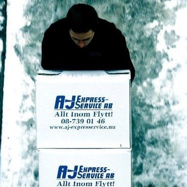 Företagsnamn A-J Express-Service AB syns på flyttbilen, som används för att hjälpa kunder med flytt och transport i Stockholm, Uppsala och Norrtälje.